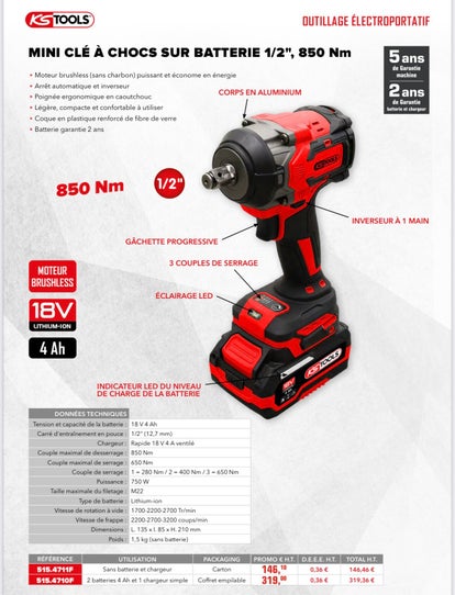 PACK MINI CLÉ À CHOCS SUR BATTERIE 1/2", 850 Nm 2 BATT 18v 4Ah CHARGEUR RAPIDE COFFRET