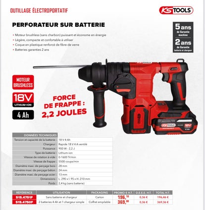 PACK CLÉ À CLIQUET SUR BATTERIE 1/2' 18V 2 BATT 18V 4Ah CHARGEUR RAPIDE COFFRET