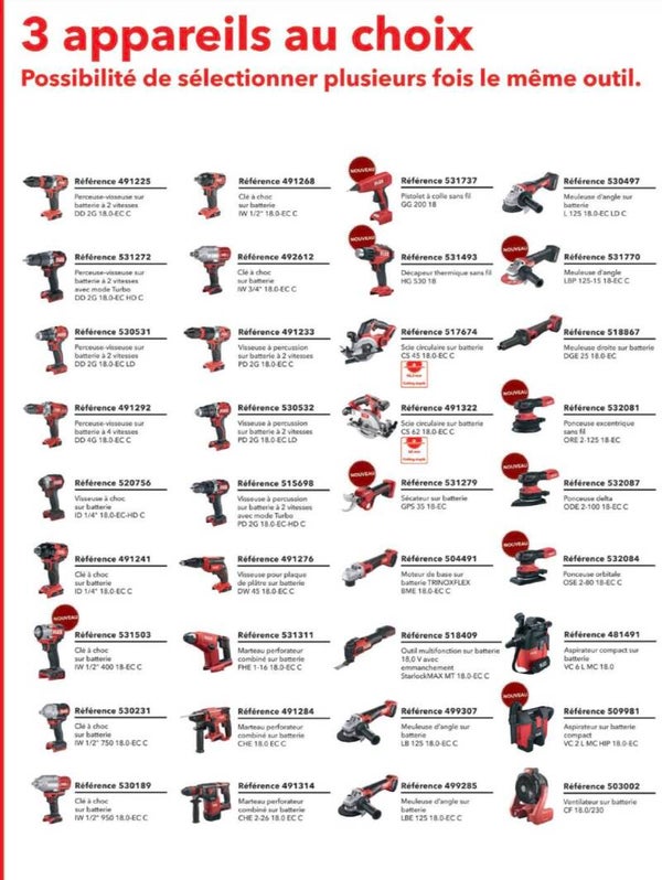 Nous rajoutons a votre choix des 3 machines 1 chargeur digital 18v + 3 batteries 18v 5Ah + 1 superbe sac de transport thermoformé