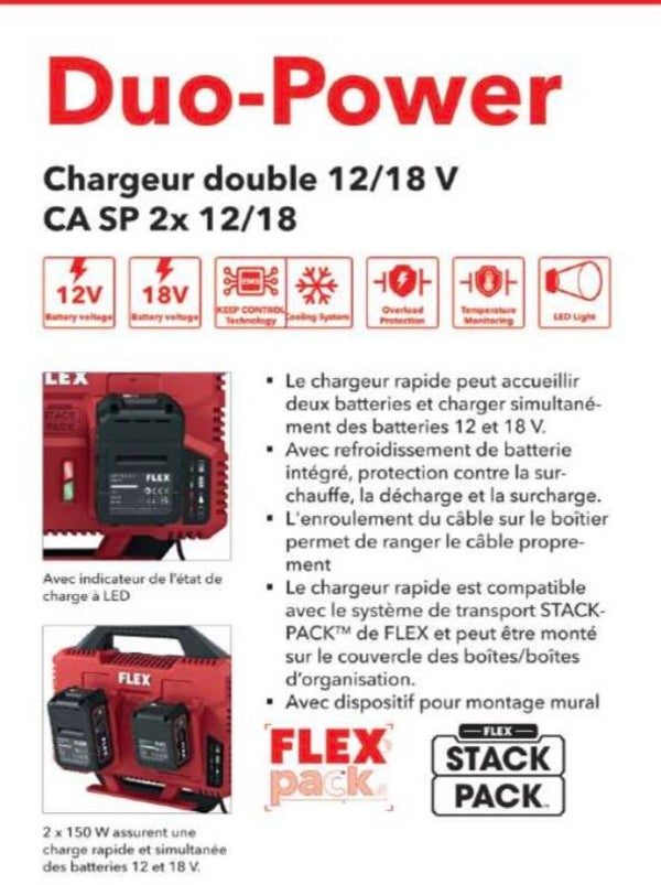 * Le chargeur rapide peut accueillir deux batteries et charger simultanément des batteries 12 et 18 V.