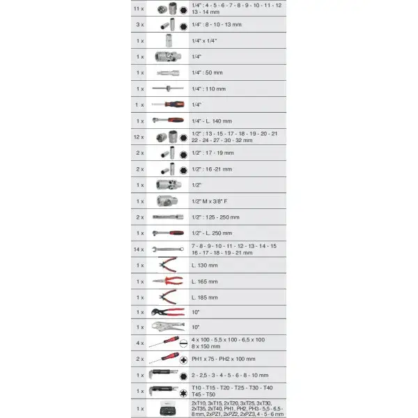 - 12 douilles : 13-15-17-18-19-20-21-22-24-27-30-32 mm