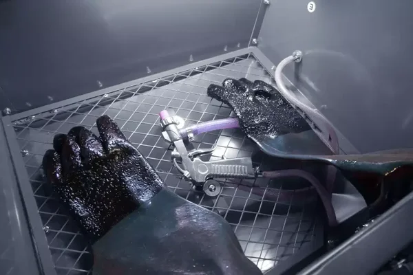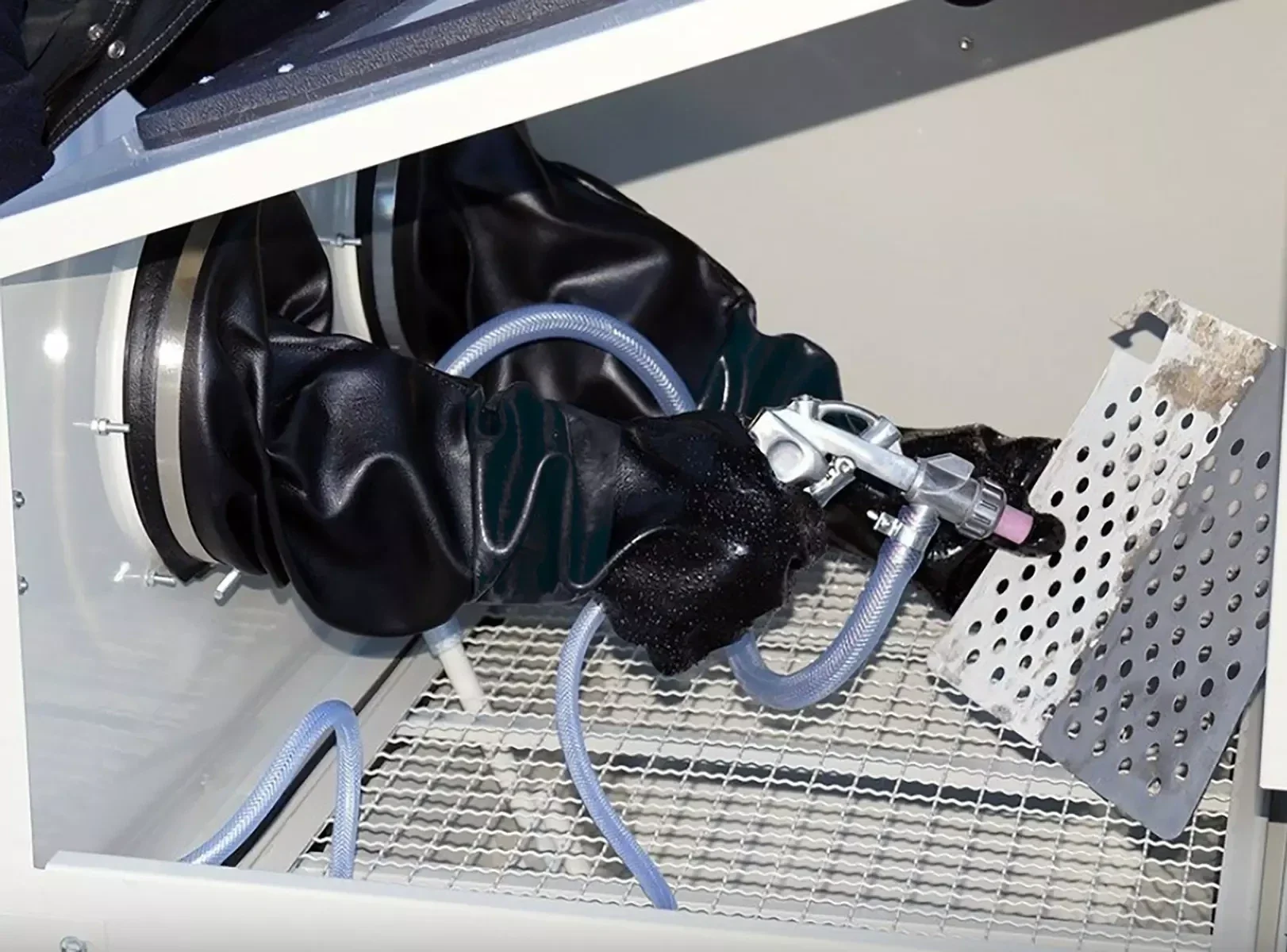 - L'éclairage LED intégré assure une visibilité optimale pendant les opérations de sablage, permettant un travail précis même dans les conditions de faible luminosité.