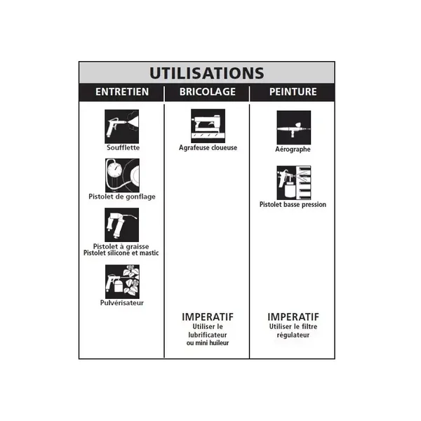 8 bar de pression pour ce compresseur ultra compact ! Utilisation facilitée par un panneau de contrôle simplifié regroupant un bouton de mise en route ON/OFF et un manomètre à lecture simplifiée.