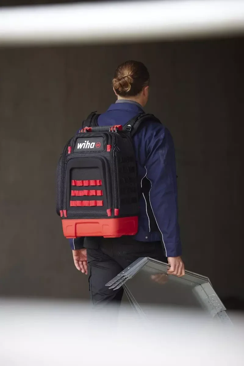 Lorsque vous avez beaucoup de travail, vous avez besoin d'avoir les mains libres. Le sac à dos d'outils pour électriciens de Wiha est la solution idéale qui offre une liberté illimitée grâce à son design. Son système de compartiments élaboré offre une organisation claire et un accès facile aux outils. Avec son ouverture à 1/3, ce sac à dos permet un accès rapide et pratique. Les 77 possibilités de rangement et les 30 fixations supplémentaires permettent de le personnaliser avec d'autres outils et accessoires. La coque robuste, à la base du sac à dos, lui offre une position stable et lui permet de tenir tout le temps debout lorsqu'il est ouvert. De plus, grâce à son matériau robuste, il est très utile dans les environnements de travail humides et sales. Par ailleurs, ce sac à dos d'outils n'est pas uniquement un atelier à emporter partout, c'est aussi un bureau mobile. Un compartiment offre un rangement protégé et propre pour un ordinateur, un téléphone et des documents, séparés des outils.Le matériau respirant, les éléments réglables ainsi que la poignée antidérapante offrent un port du sac comfortable. Il répond aux exigences les plus élevées grâce à son matériau extérieur 1680D de qualité supérieure et à ses fermetures éclair YKK. Pour les objets personnels ou fragiles, il y a de la place dans plusieurs compartiments rembourrés.En plus d'un jeu de dix clés mâles, ce sac à dos contient également pour les travaux de vissage, six tournevis ergonomiques et le PocketMax®, qui, grâce à leur certification VDE, garantissent un travail sûr et protégé. Par ailleurs, les pinces universelles et demi-rondes ainsi que la pince coupante diagonale isolées garantissent également la sécurité du travail. Toutes les tâches de maintien, de vissage et de coupe peuvent donc être réalisées. Le niveau à bulles de Wiha, le mètre pliant ainsi que l'outil de dénudage multifonctions, viennent compléter cette composition d'outils pour les électriciens. De plus, ce sac à dos peut être personnalisé grâce au système universel MOLLE. On trouve sur internet une large palette d'accessoires pour ses accroches pratiques permettant ainsi de compléter et d'élargir le sac à dos (non inclus dans le produit). Avec ce sac à dos d'outils professionnel et sa composition d'outils Wiha de qualité supérieure, vous avez toujours tout ce qu'il faut où que vous soyez!