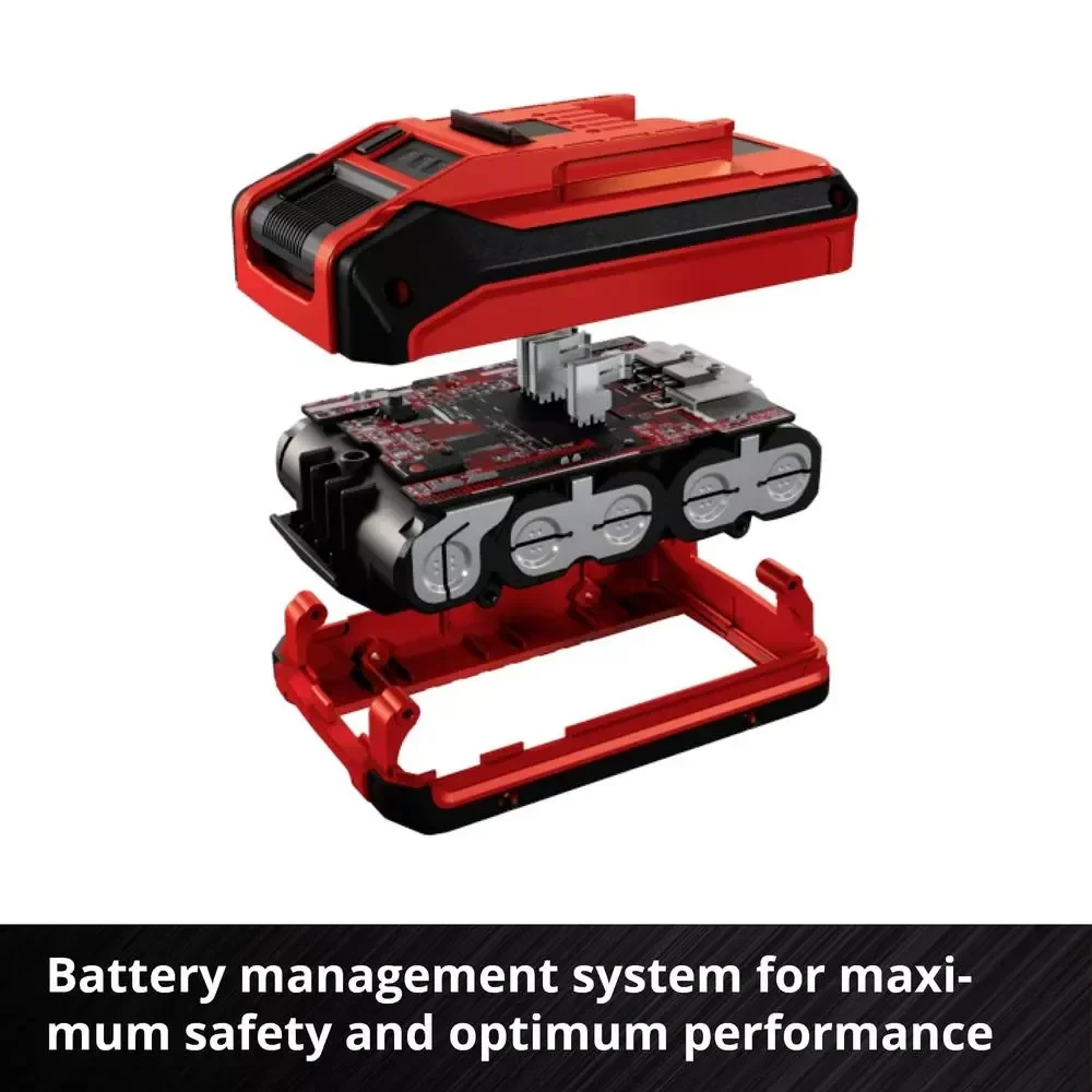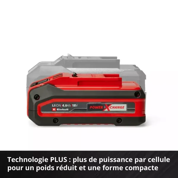 La batterie 18 V 4,0 Ah Power X-Change PLUS Einhell fait partie de la gamme de batteries multifonctions et combinables à l’infini Power X-Change de Einhell. Les batteries universelles Power X-Change puissantes et durables alimentent tous les appareils de jardinage et de bricolage sans fil de cette gamme. Les bénéfices pour le client sont évidents : avec un système universel de batteries et chargeurs compatible avec tous les appareils, on réalise des économies importantes à l’achat, on préserve l’environnement et on gagne en flexibilité pour les travaux dans la maison et au jardin. On évite en outre le désordre occasionné par l’utilisation de batteries et de chargeurs multiples pour un seul et même appareil. Les cellules lithium-ion dernière génération offrent 100 % de puissance en plus pour une performance maximale dans toutes les applications. Elles s’accompagnent d’un design 13 % plus compact et d’un poids réduit de 12 %. Par ailleurs, la technologie PLUS assure une puissance accrue pour les travaux exigeants. La batterie haute performance résiste en outre à l’effet mémoire et au phénomène courant d’auto-décharge, et délivre une puissance élevée et constante. La batterie PXC PLUS 18 V 4,0 Ah est un système de pointe au sein de la gamme Power X-Change, et convient également pour une utilisation en TWIN-PACK pour les outils 36 V. Le système de gestion de batterie actif ABS comprend un microprocesseur qui contrôle en continu les paramètres de la batterie. Il assure ainsi un très haut degré de sécurité, une performance optimale des appareils, ainsi qu’un temps de fonctionnement et une durée de vie maximum. L’état de charge peut être contrôlé à tout moment grâce à l’indicateur LED à trois niveaux. Le boîtier est conçu pour résister à la poussière, à la corrosion et aux contraintes mécaniques. Le revêtement caoutchouc confère à la batterie une protection élevée contre les chocs et une bonne prise en main. La batterie peut être retirée très facilement de tous les appareils au moyen de sa poignée encastrée.