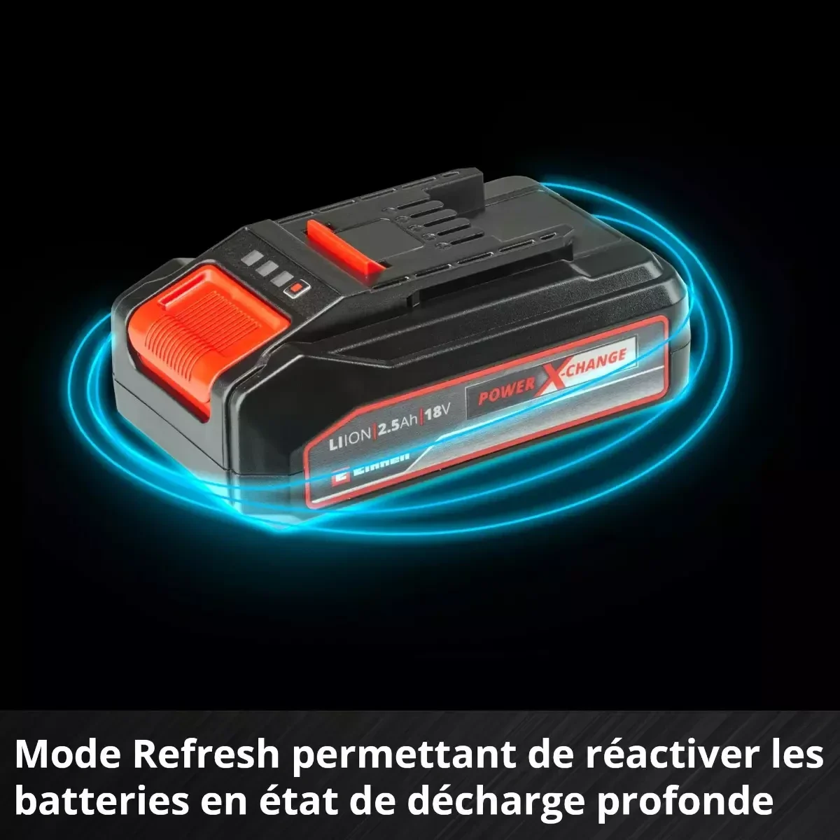 Le starter-kit Power X-Change 18 V 2,5 Ah Einhell est idéal pour commencer ou étoffer sa collection d’outils Power X-Change. Le starter-kit composé d’une batterie Power X-Change 18 V 2,5 Ah et d’un chargeur rapide fait partie de la gamme de batteries Power X-Change multifonctions et totalement interchangeables de Einhell. Les batteries universelles Power X-Change puissantes et durables alimentent tous les appareils sans fil de cette gamme de produits utilisés pour les travaux de jardinage et de bricolage. Les chargeurs de la gamme sont aussi universellement compatibles avec toutes les batteries Power X-Change. Les bénéfices pour le client sont évidents : avec un système universel de batterie et chargeur compatible avec tous les appareils, on réalise des économies importantes à l’achat, on préserve l’environnement et on gagne en flexibilité pour les travaux dans la maison et au jardin. On évite en outre le désordre occasionné par l’utilisation de batteries et chargeurs multiples pour un seul et même appareil. La batterie haute performance résiste à l’effet mémoire et au phénomène courant d’auto-décharge, et délivre une puissance élevée et constante. La batterie Power X-Change 18 V 2,5 Ah est l’élément de base idéal de la gamme Power X-Change, et convient également pour une utilisation en TWIN-PACK pour les outils 36 V. Le système de gestion de batterie actif ABS comprend un microprocesseur qui contrôle en continu les paramètres de la batterie. Il assure ainsi un très haut degré de sécurité, une performance optimale des appareils, ainsi qu’un temps de fonctionnement et une durée de vie maximum. L'état de charge peut être contrôlé à tout moment grâce à l’indicateur LED à trois niveaux. Le boîtier est conçu pour résister à la poussière, à la corrosion et aux contraintes mécaniques. La batterie peut être retirée très facilement de tous les appareils au moyen de sa poignée encastrée. Le chargeur rapide bénéficie d’un design compact qui le rend peu encombrant. Les œillets de suspension intégrés permettent un montage mural facile. La technologie de charge rapide réduit les temps de charge, et le système de gestion de charge intelligent assure un contrôle permanent de la batterie pour un processus de charge optimal et une sécurité maximale. Le mode Refresh permet de réactiver les batteries en état de décharge profonde. L’indicateur LED d’état à 6 niveaux fournit une information immédiate.