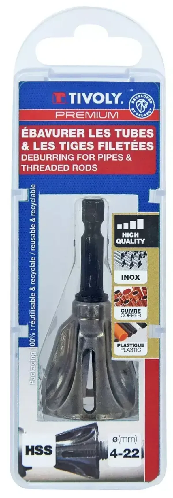 Fraise 4 lames HSS à ébavurer les tubes et les tiges filetées. Queue hexagonale 6.35mm quick change -Ø 4 à 22 mm - TIVOLY - 10333120002