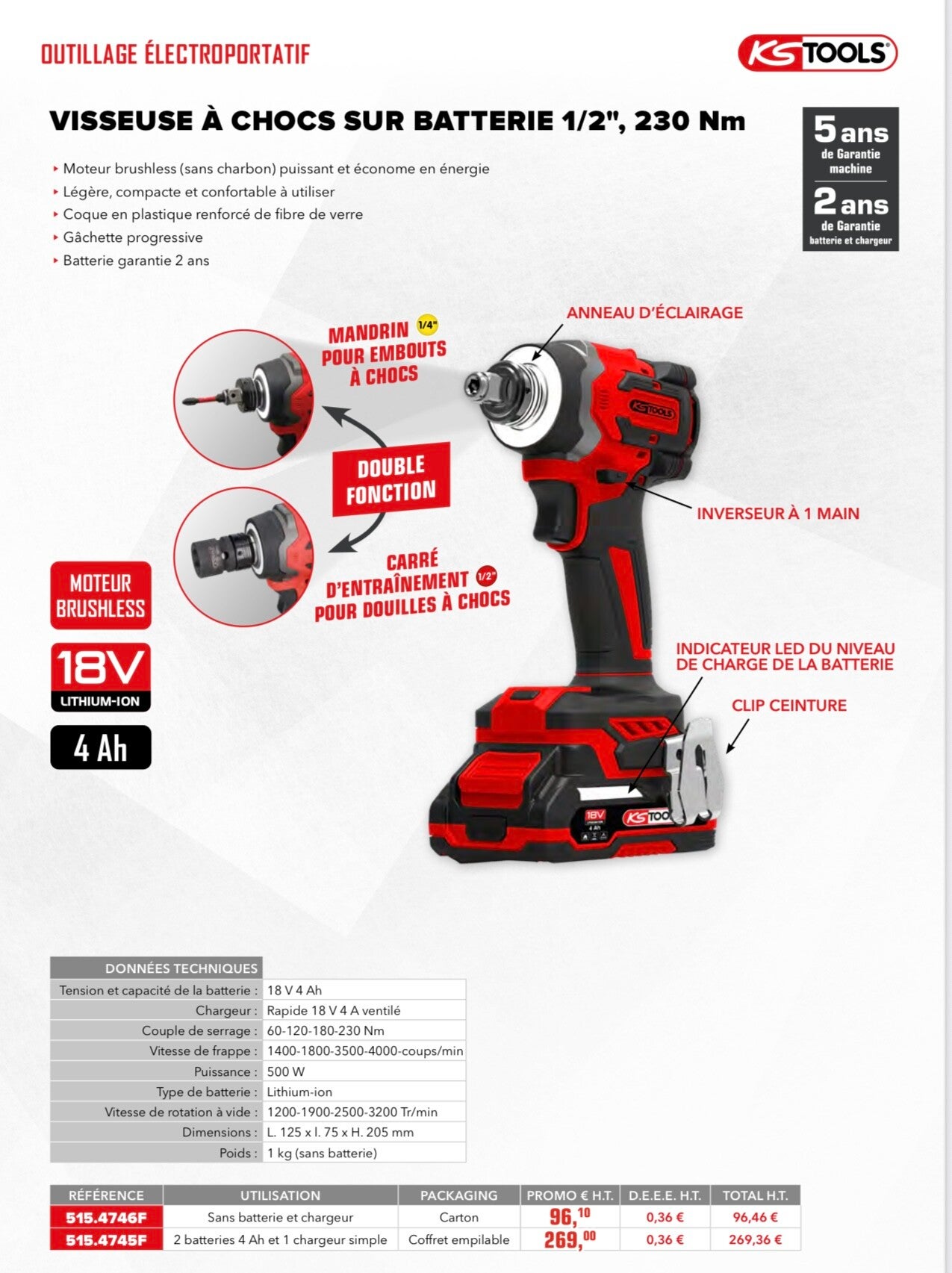 PACK VISSEUSE À CHOCS SUR BATTERIE 1/2", 230Nm 2 BATT 18v 4Ah CHARGEUR RAPIDE COFFRET