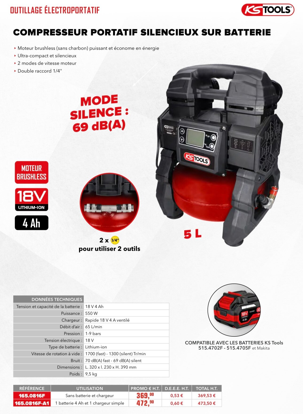 COMPRESSEUR PORTATIF SILENCIEUX SUR BATTIE 1 BATT 18V 4Ah et CHARGEUR RAPIDE