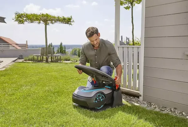 - Le couvercle pliable permet un accès facile au panneau de commande de la tondeuse robot.