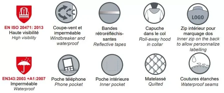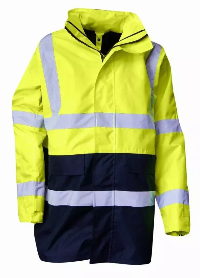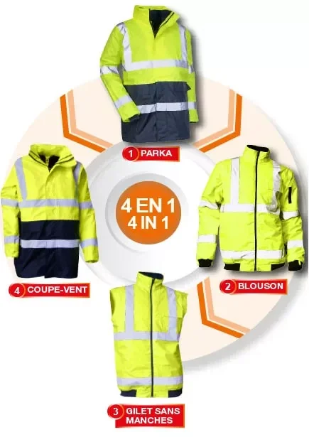 Parka 4 en 1 (parka, blouson, gilet sans manches, coupe vent) haute visibilité.