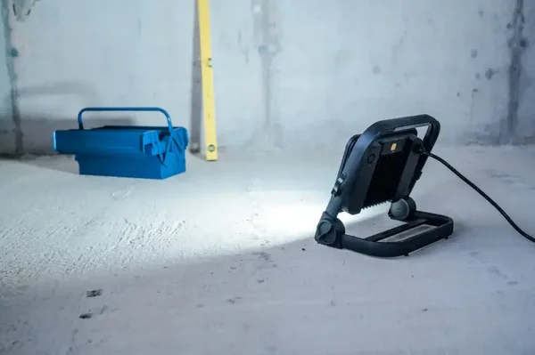 Phare de chantier LED avec support en acier équipé d'angles de protection et d'une poignée de transport ergonomique en plastique - idéal pour une utilisation sur chantier, atelier, garage.