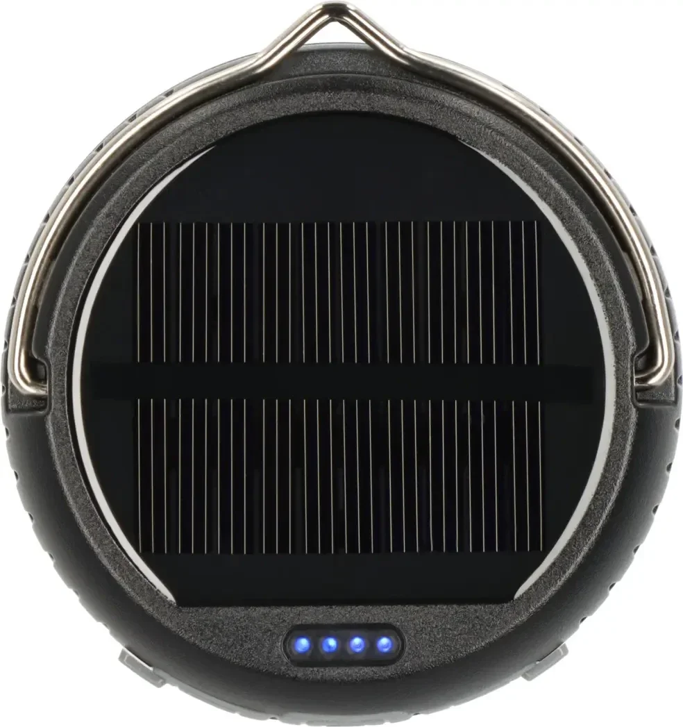 Lampe lanterne LED solaire avec dôme non éblouisssant (anneau circulaire) et spot - interrupteur avec multiples modes d'éclairage - anse rabattable et mousqueton pour une accroche facile.