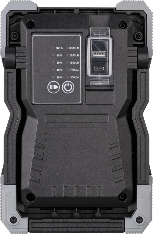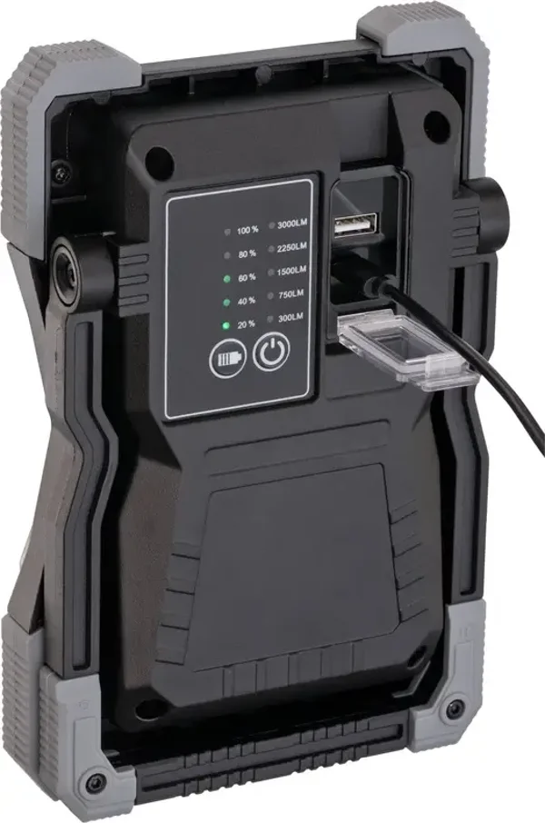 Lampe de chantier LED avec batterie Li-lon 7,4V/5Ah intégrée avec fonction Powerbank, 1 interrupteur pour éclairage et 1 interrupteur poussoir avec 5 témoins de charge (100% - 80% - 60% - 40% - 20%)