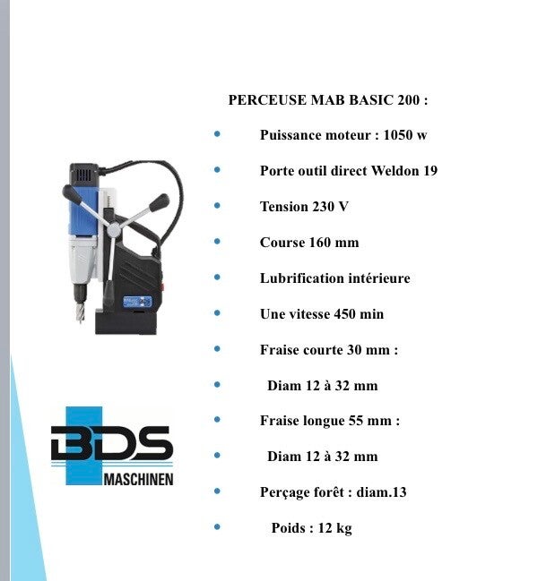 PERCEUSE MAB BASIC 200 : Puissance moteur: 1050 w Porte outil direct Weldon 19