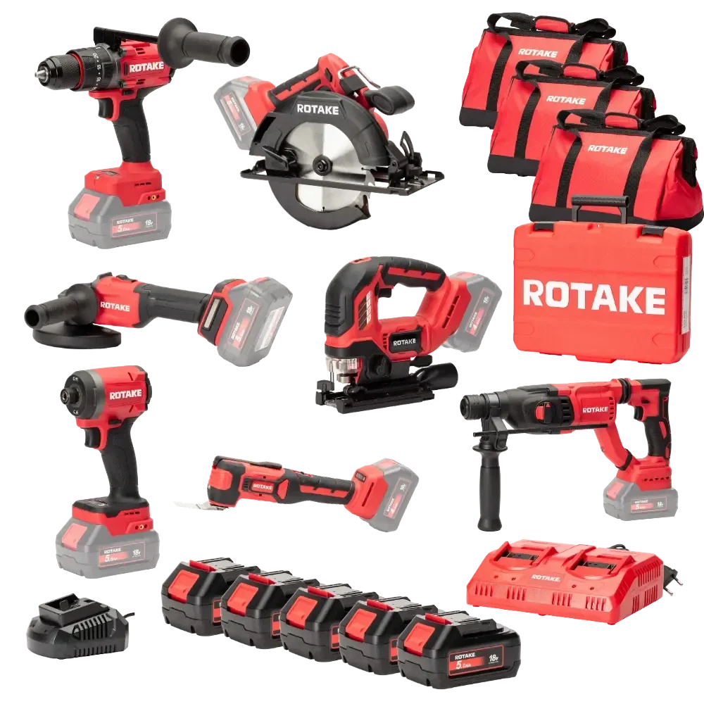 Ensemble de 7 machines ROTAKE 18V - Perceuse visseuse à percussion D2H + Meuleuse 125 + PERFORATEUR + Scie circulaire + Visseuse à chocs + Scie sauteuse + Outil multifonction - ROTAKE - avec 5 batteries 18V 5Ah + chargeur double + 3 sacs - LOT02