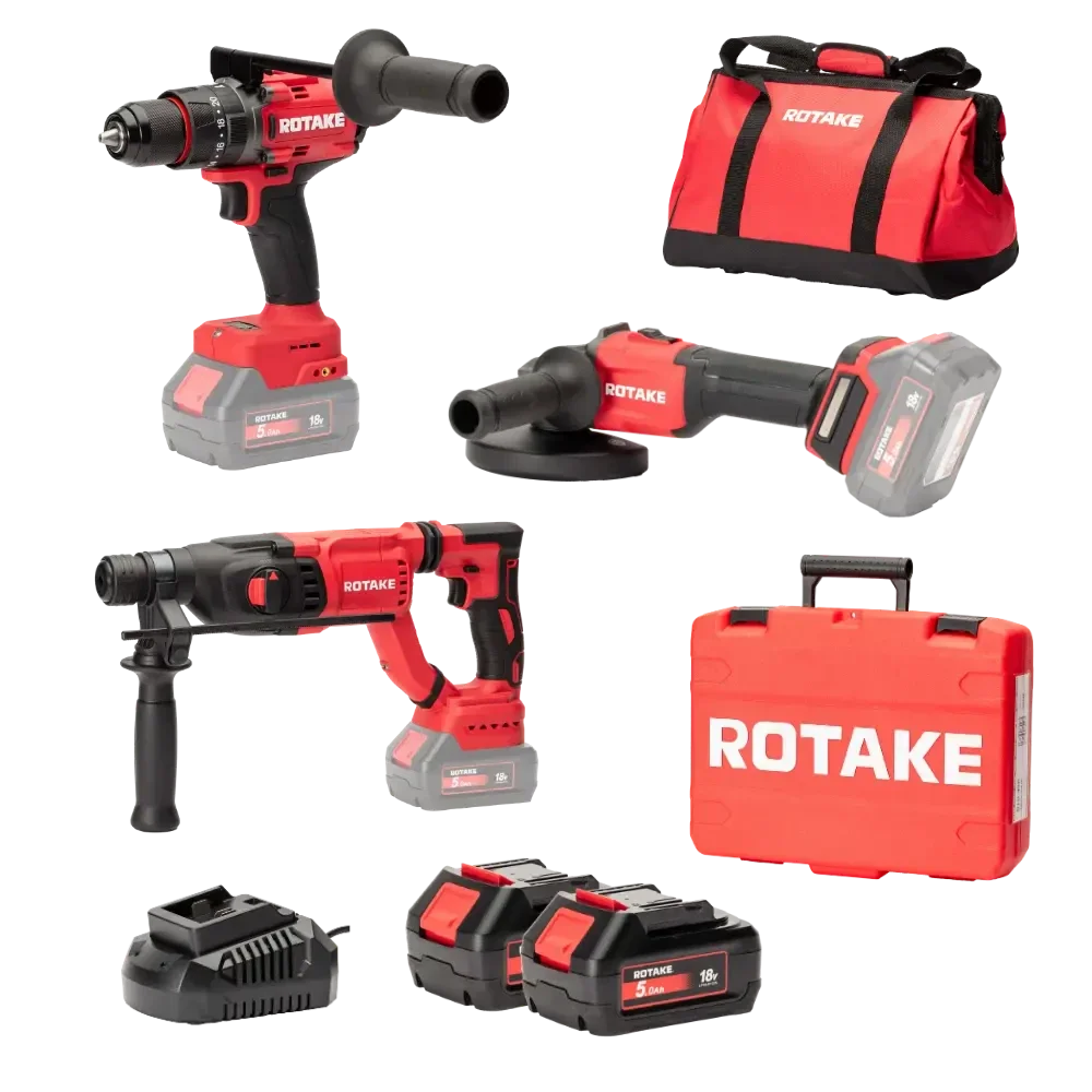 Ensemble de 3 machines ROTAKE 18V - Perceuse visseuse à percussion D2H-50D + Meuleuse G1-125 + Perforateur 8902 + 2 batteries 18V 5Ah - ROTAKE avec 1 sac de transport - LOT05