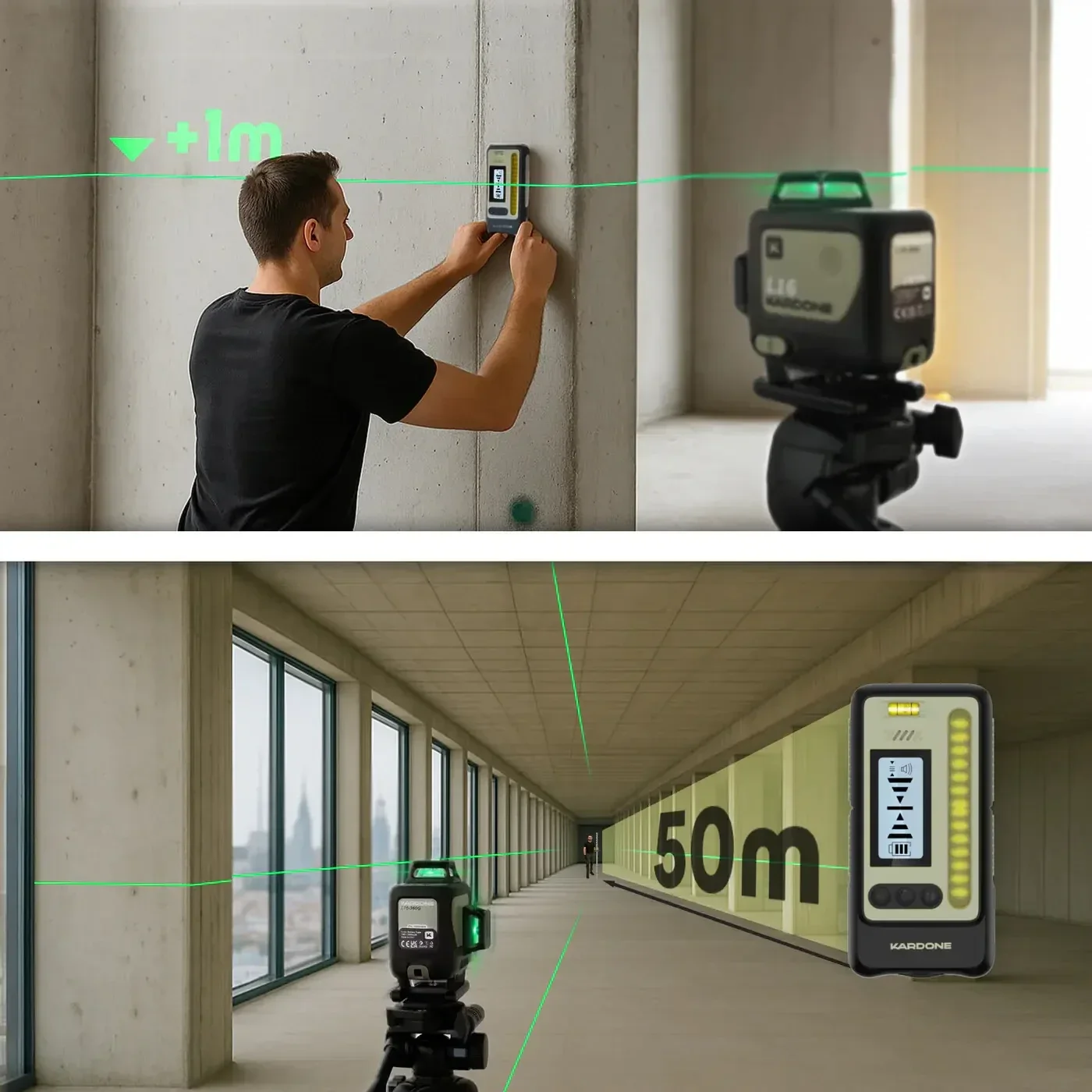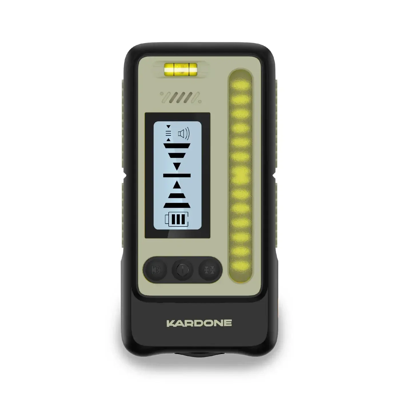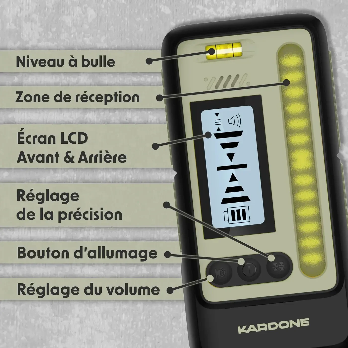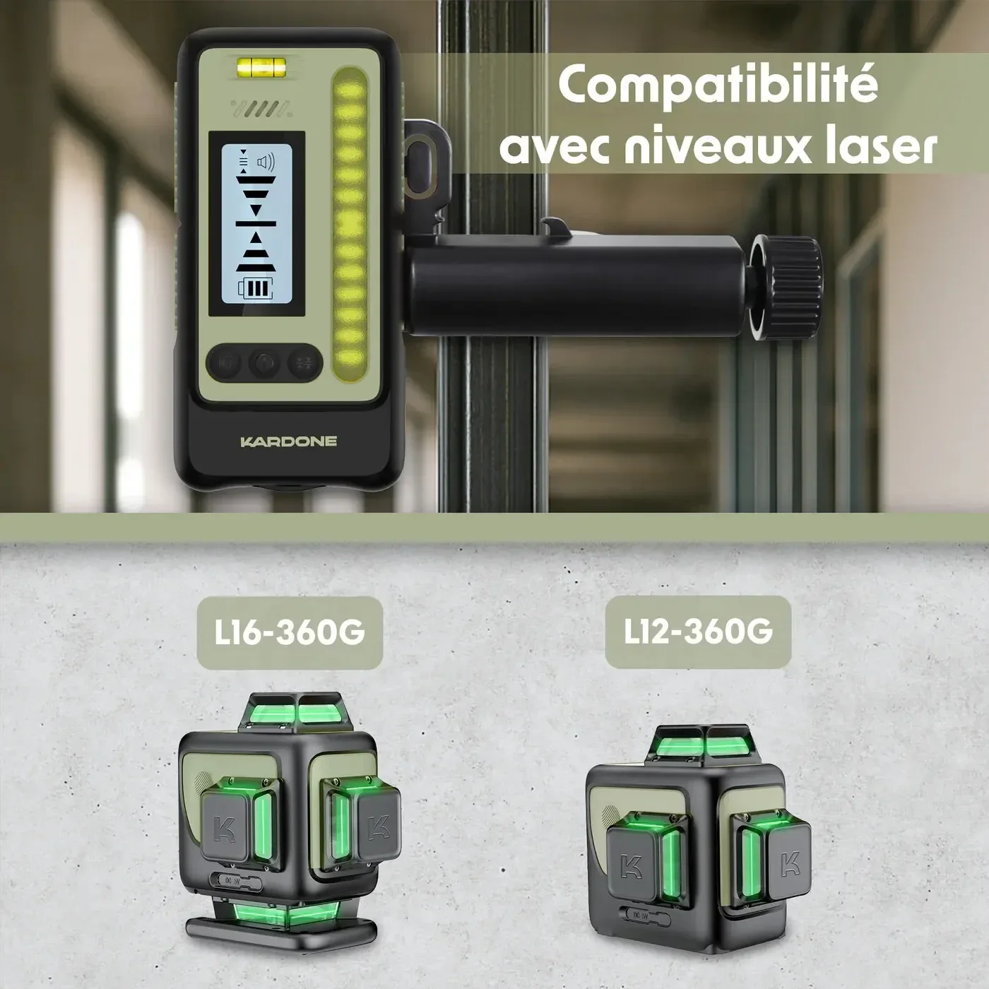 Ce récepteur est compatible avec les lasers Kardone L12 et L16, et prend en charge le mode impulsion jusqu’à 50m , idéal pour les environnements lumineux ou les longues distances. Son double écran LCD (avant et arrière) associé à des niveaux à bulle intégrés permet une lecture claire et rapide.