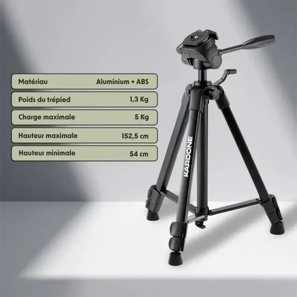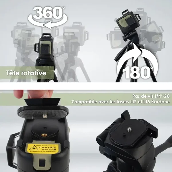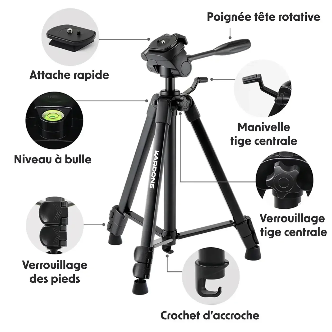 Le trépied fournit un multi-ajustement polyvalent, y compris la rotation horizontale, la rotation verticale et l'ajustement en hauteur, et répond à un large éventail d'applications.