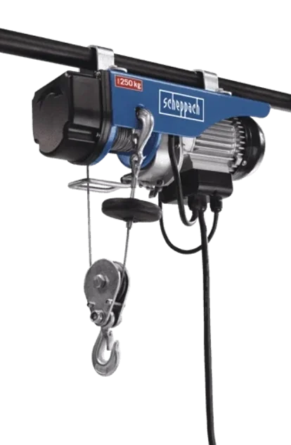 Palan électrique de marque Scheppach, pouvant soulever jusqu'à 250 Kg, très utile pour lever des charges lourdes dans votre garage ou votre atelier.